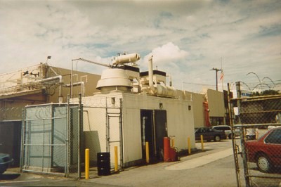 Enclosed in a hospital grade, sound attenuation enclosure is a refurbished G398, 350 kW Caterpillar. This system is classified as a cogeneration system because the waste heat from the block and exhaust are recovered to heat the facility's plating tanks as the natural gas powered generator set generates power for the plant. The waste heat is used to heat the facility's metal plating tanks. A top the enclosure, the remote load balance radiators and the catalytic converter are clearly visible. The radiators liquidate excess heat when there is no requirement for heating the plating tanks. On the left, within the fence, one can see the paralleling switch gear. This cogeneration system provides power and process heat to a high tech , precious metals platter of aircraft and electronic parts.