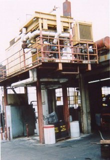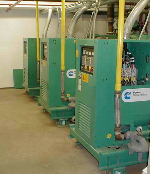 A refurbished, 350 kW G398 Caterpillar Genset furnishes the electricity to the plating facility. The power is "paralleled" to Los Angeles Department of Water and Power. The recovered heat keeps the plating tanks how and the back-up boiler virtually off. The paralleling switch gear is under the platform. This is an induction type generator and does not have "black start" capability. An induction generator relies on the Utility for "excitement" , a synchronous generator creates its own "excitement".